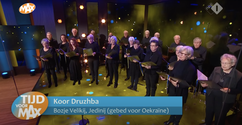 Terwijl we bezig waren met de voorbereidingen van ons benefietconcertje, kwam er een eervolle uitnodiging van Omroep MAX om op maandag 7 maart in de studio te Hilversum een optreden te verzorgen. Tijdens de uitzending van ‘Tijd voor Max’ zongen wij het gebed voor ‘Vrede, Rust, goede gaven, waakzaamheid over het land Oekraïne en een lang en gelukkig leven voor allen’ (zie foto).